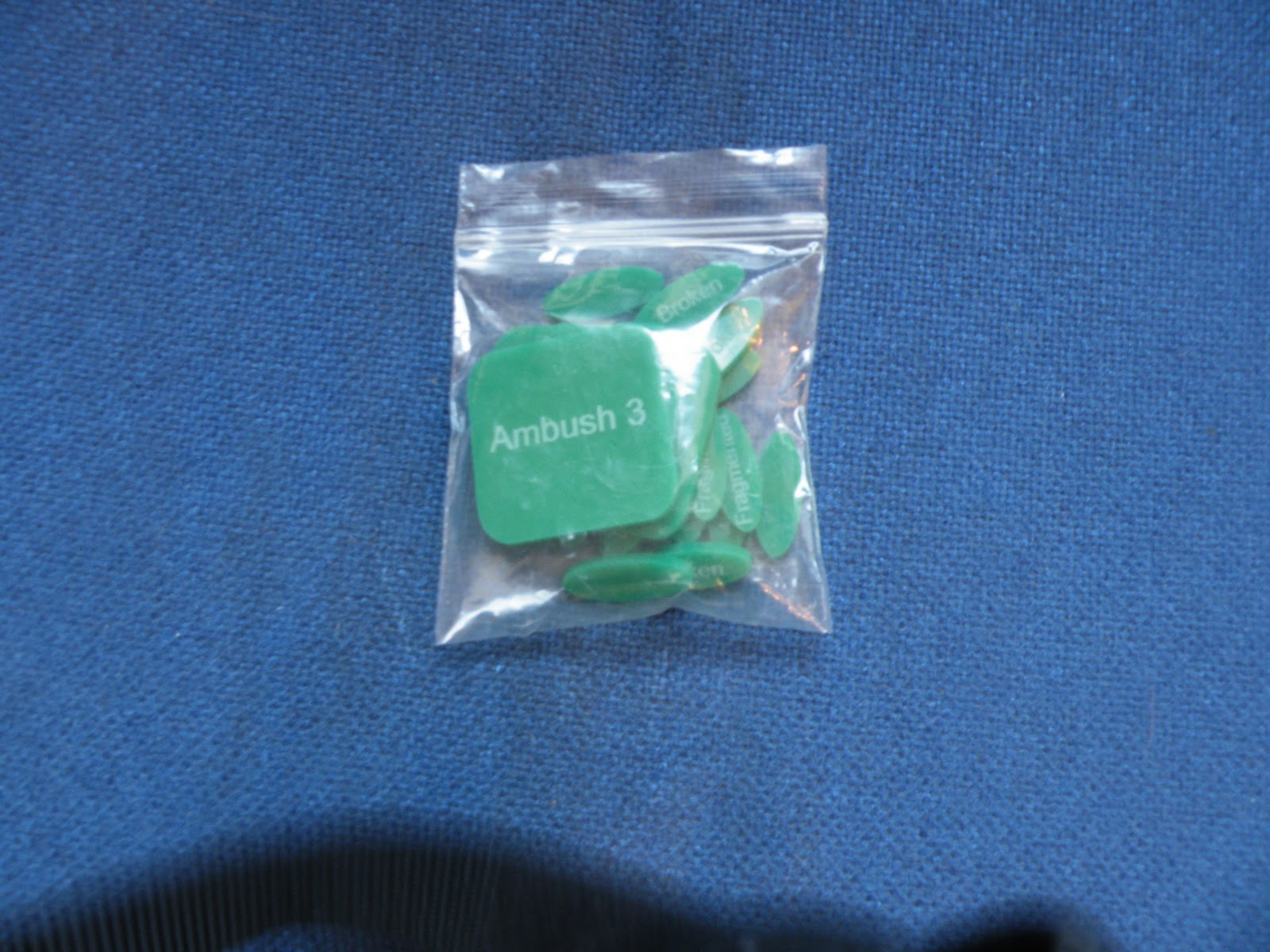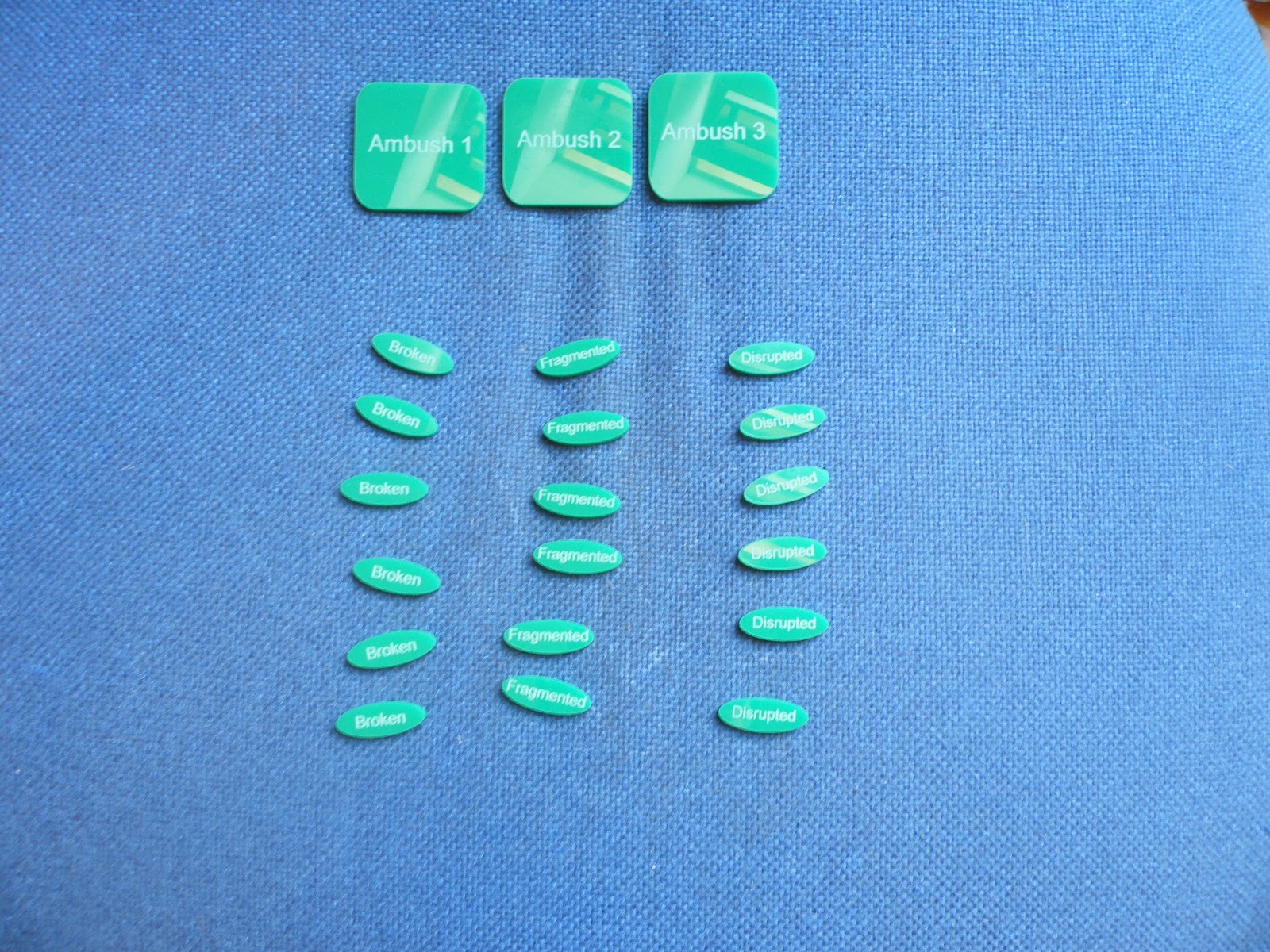 Again, I can’t fault the quality. Neatly cut and the white lettering is more subdued. My only concern is the size. I found them a little fiddly to manipulate but that may just be my chubby fingers! The one colour for all makes it easy to have a different set for each player and the ambush markers are a bonus.