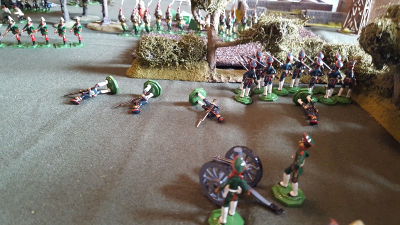 In the centre I pushed forward both Jaegers and these were to do sterling work peppering the advancing troops and holding them back. The Russian Jaegers found alcohol in the nearby house and become very drunk but still fought on until the remaining officer charged the enemy, pistol in one hand and broken bottle in the other, to die a heroes death!
