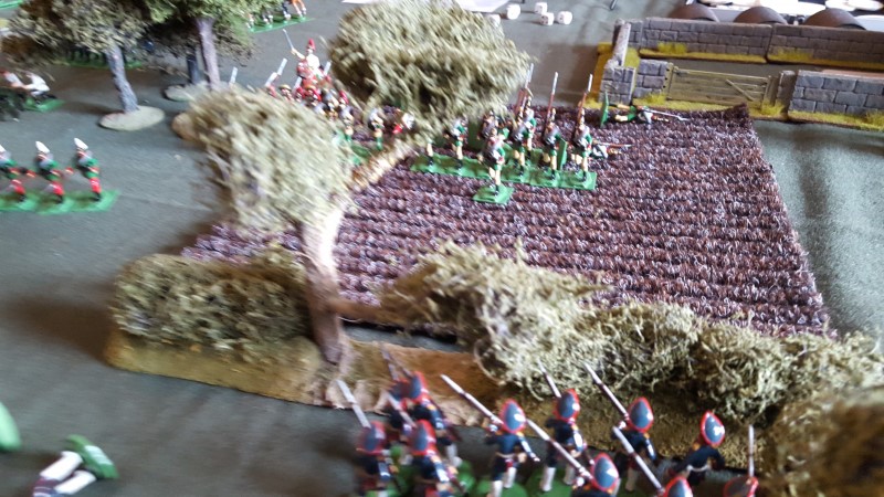 In the centre I pushed forward both Jaegers and these were to do sterling work peppering the advancing troops and holding them back. The Russian Jaegers found alcohol in the nearby house and become very drunk but still fought on until the remaining officer charged the enemy, pistol in one hand and broken bottle in the other, to die a heroes death!
