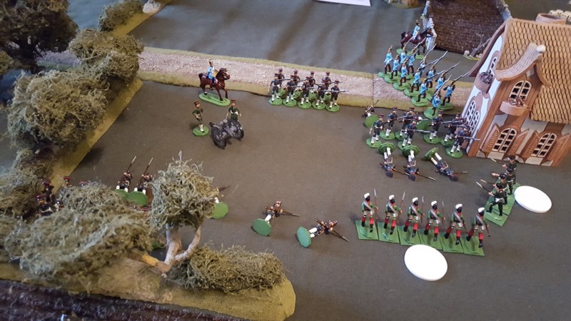 In the centre I pushed forward both Jaegers and these were to do sterling work peppering the advancing troops and holding them back. The Russian Jaegers found alcohol in the nearby house and become very drunk but still fought on until the remaining officer charged the enemy, pistol in one hand and broken bottle in the other, to die a heroes death!