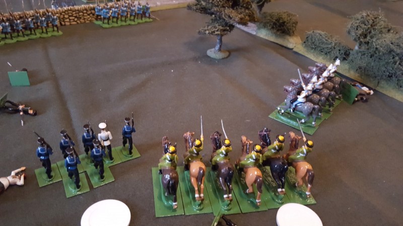 On the right, things were not going well for the cavalry. With the Erbprinz advancing valiantly into the fray (or hiding behind a big wall as some would call it…) there was little point in a frontal attack. And getting too close put them at risk from the gun, and staying back allowed the gun and troops to shoot across at the other troops. And when the movement was reduced to half there was no way they could redeploy to the left, and advancing was slow and left them exposed for too long. After a lot of effort I finally got both heavy units brigaded again only for a random Boy Scout to offer to lead them around the flank only to abandon them in a walled enclosure further to the rear! Although the Cuirassiers and the Cossacks tried to advance they were shot to pieces before getting anywhere near the halved charge range! Finally, they and the Naval Battalion in the centre started to withdraw having already lost the machine gun.