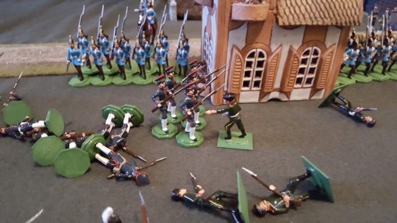 In the centre I pushed forward both Jaegers and these were to do sterling work peppering the advancing troops and holding them back. The Russian Jaegers found alcohol in the nearby house and become very drunk but still fought on until the remaining officer charged the enemy, pistol in one hand and broken bottle in the other, to die a heroes death!
