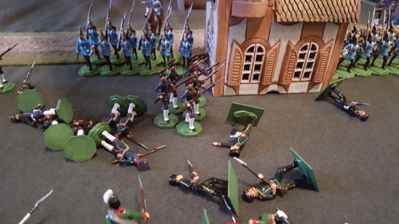 In the centre I pushed forward both Jaegers and these were to do sterling work peppering the advancing troops and holding them back. The Russian Jaegers found alcohol in the nearby house and become very drunk but still fought on until the remaining officer charged the enemy, pistol in one hand and broken bottle in the other, to die a heroes death!